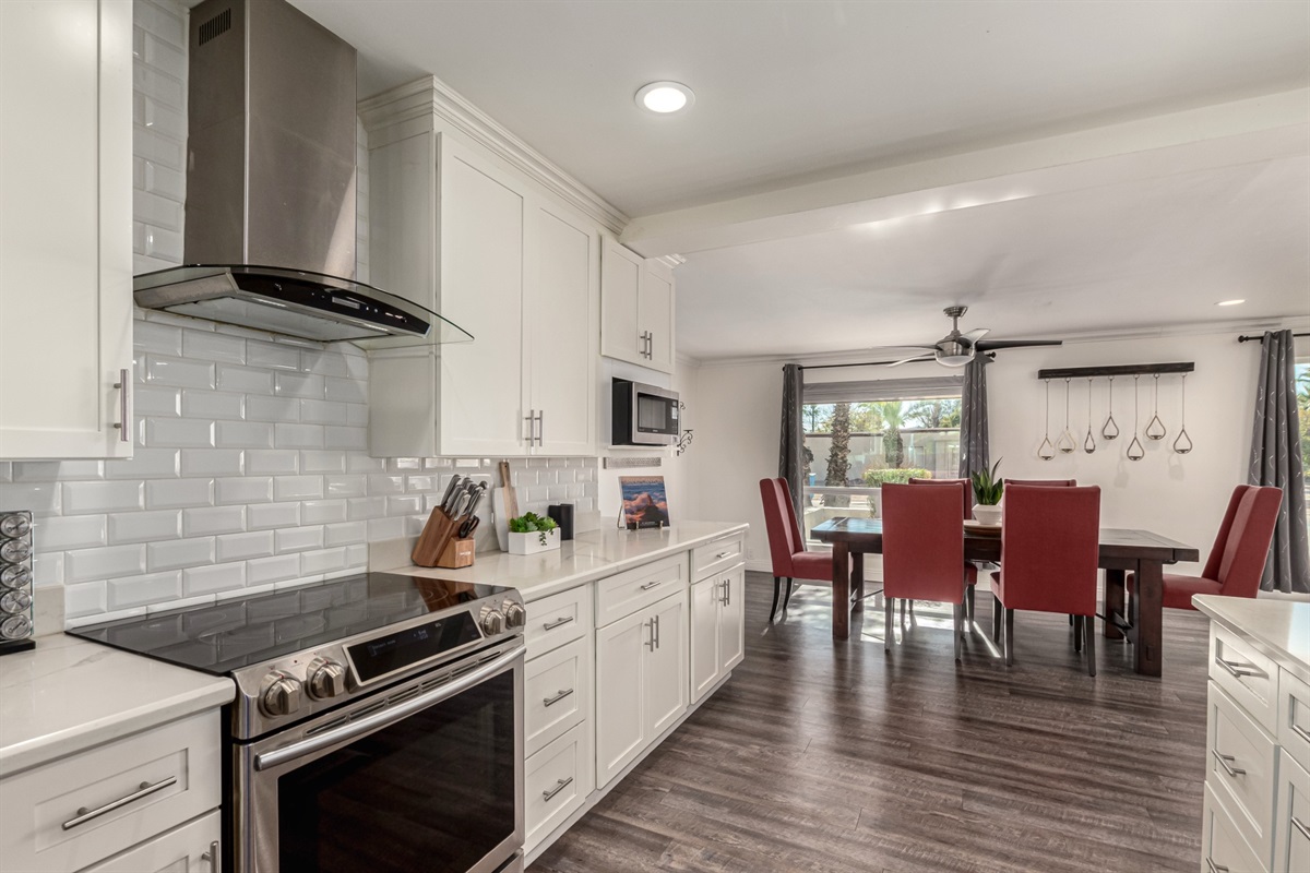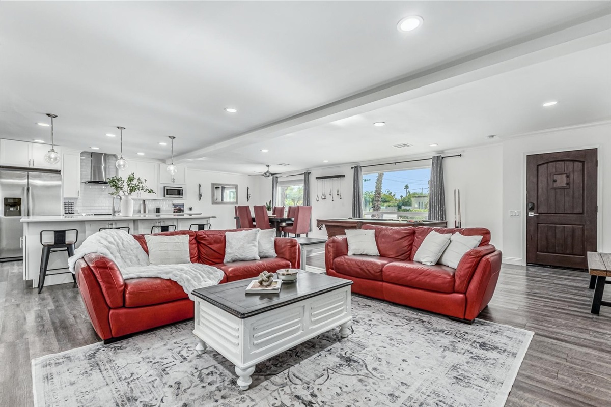 The main kitchen is large and open to the dining area, where all your guests can gather around the dining table or belly up to the kitchen bar. Take your movie nights to a new level on the living room’s flat-screen TV.