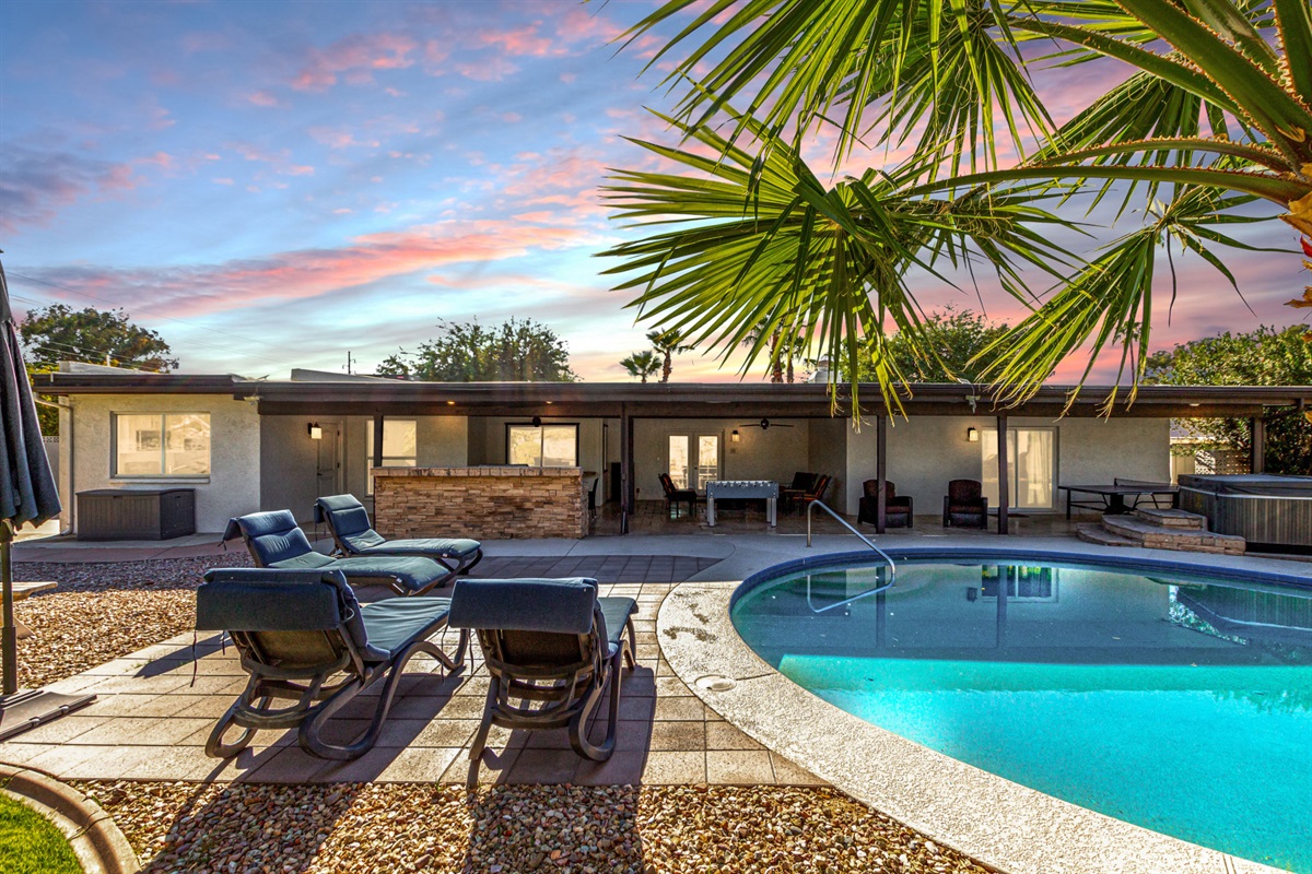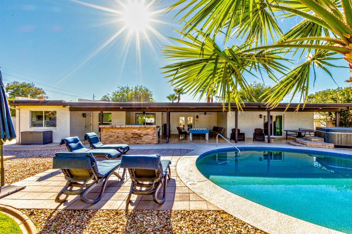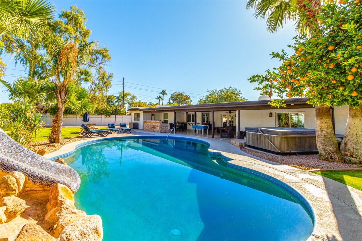 Get the best of both worlds - resort amenities combined with the comfort of a private home - at this 5BR, 3BA Scottsdale home! The private backyard boasts top-notch amenities such as a large spa and outdoor pool, foosball, and air hockey tables. You’ll feel right at home in the spacious and completely-remodeled home. Guest quarters give you even more flexibility and privacy.