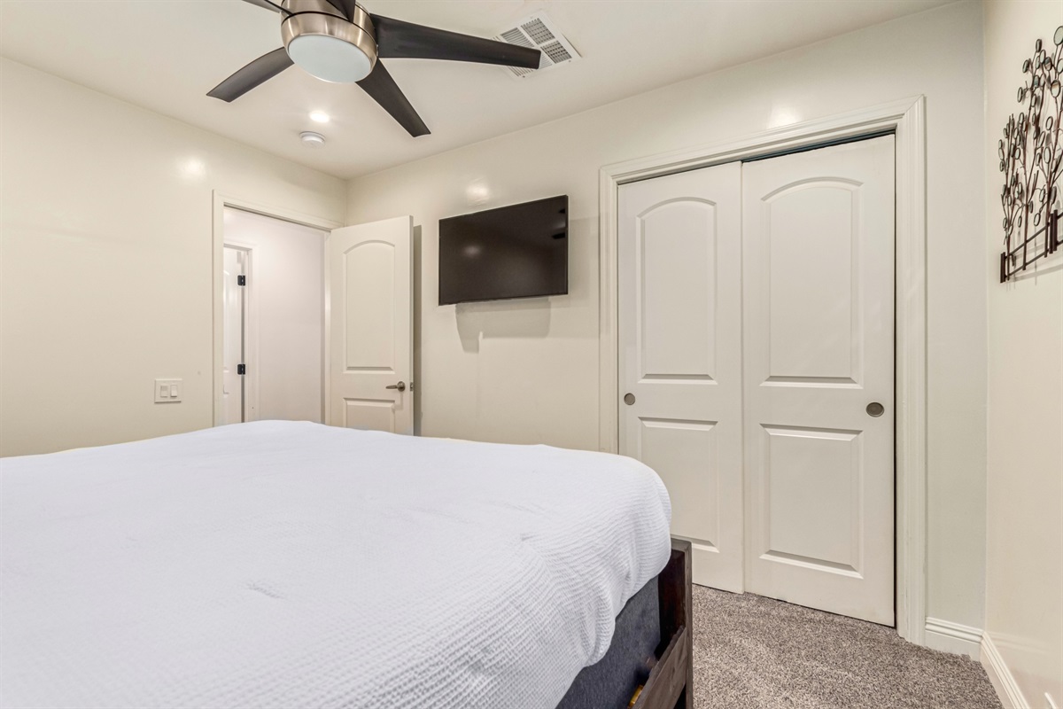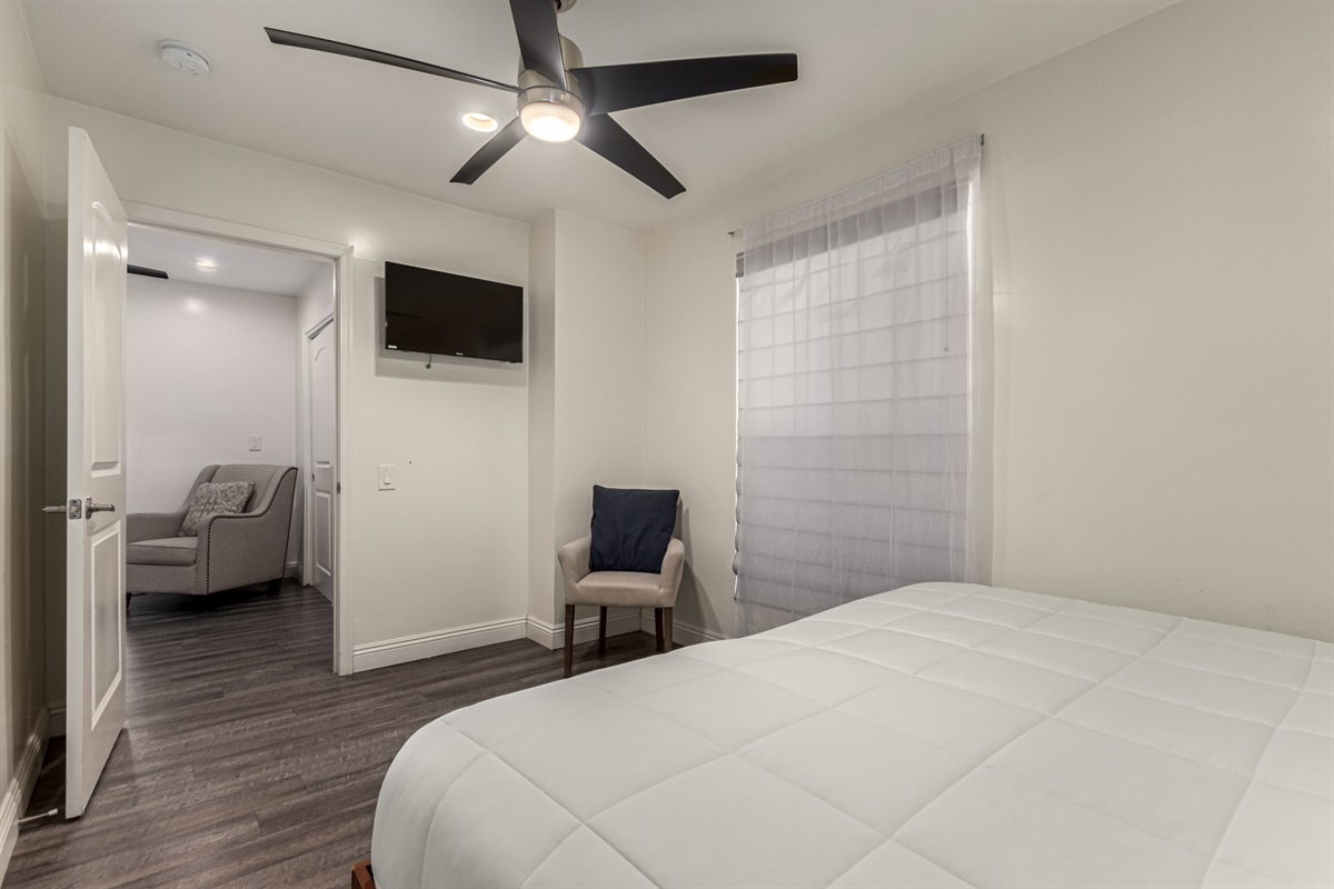 Tasteful décor and lots of space set off the master bedroom, boasting a king bed and en-suite bath with his-and-her sinks. The east side of the home functions as a private guest quarters for even more privacy and space. It has its own kitchen, living room, full bathroom and two bedrooms.