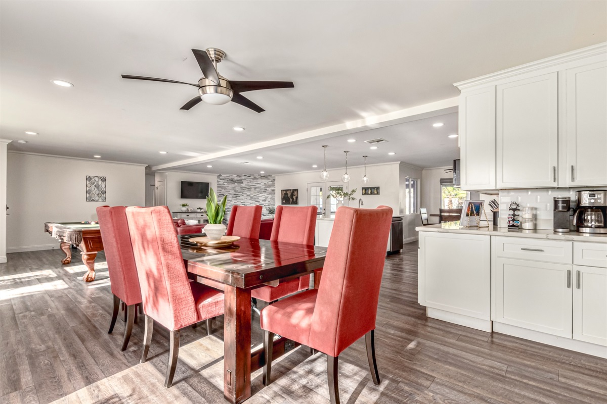 We had a wonderful stay at The Charter Oak House. Backyard has all the amenities, pool, hot tub, grass, fabulous BBQ area. Nice open concept inside for everyone to spread out, lot's of seating areas. Lots of room for our group of 12 to celebrate Thanksgiving. Kitchen island is a great spot to gather, however it would be nice to have a bit larger dining table for a group of our size. Feels like you have 2 separate wings.