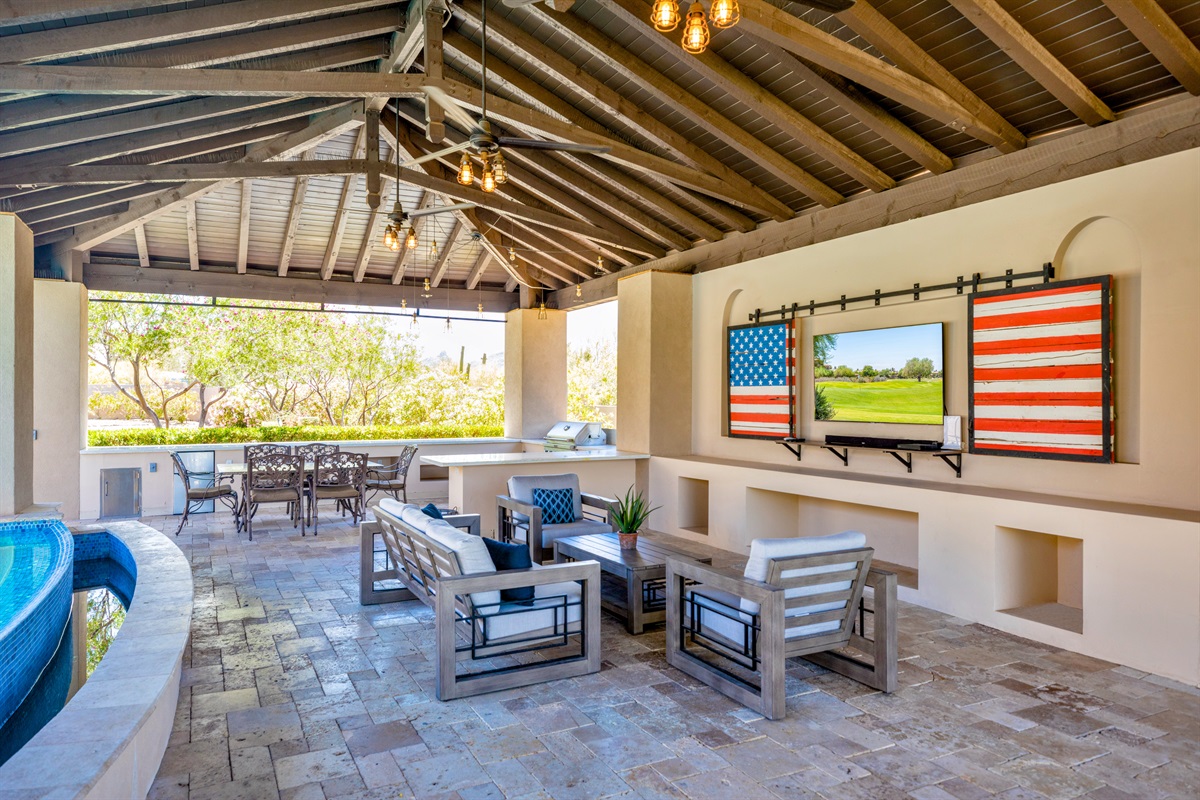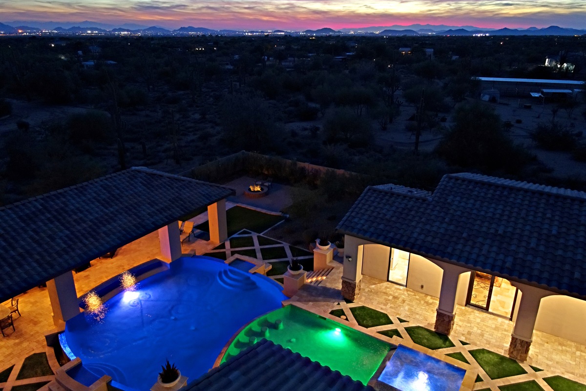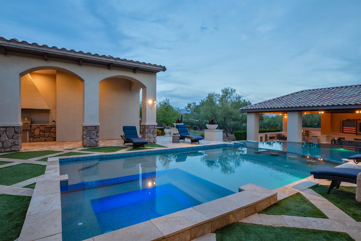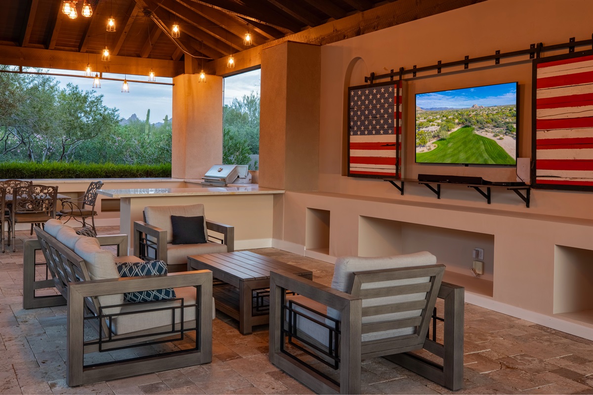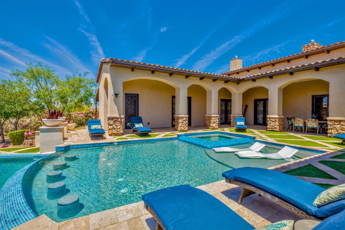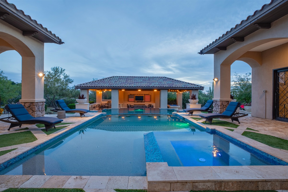 The home’s 2.5 acre property in the prestigious North Scottsdale community provides additional privacy and seclusion, making the backyard feel like your own private resort. Dine al fresco on the covered patio, cooking up your meals on one of the two natural gas built in BBQs that are available to our Guests. Nothing competes with our 3 tier/360 degree negative edge heated pool with Spa (additional cost for pool/spa heat).