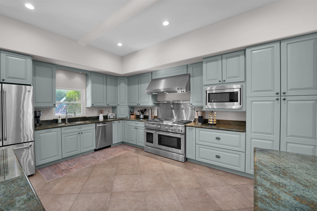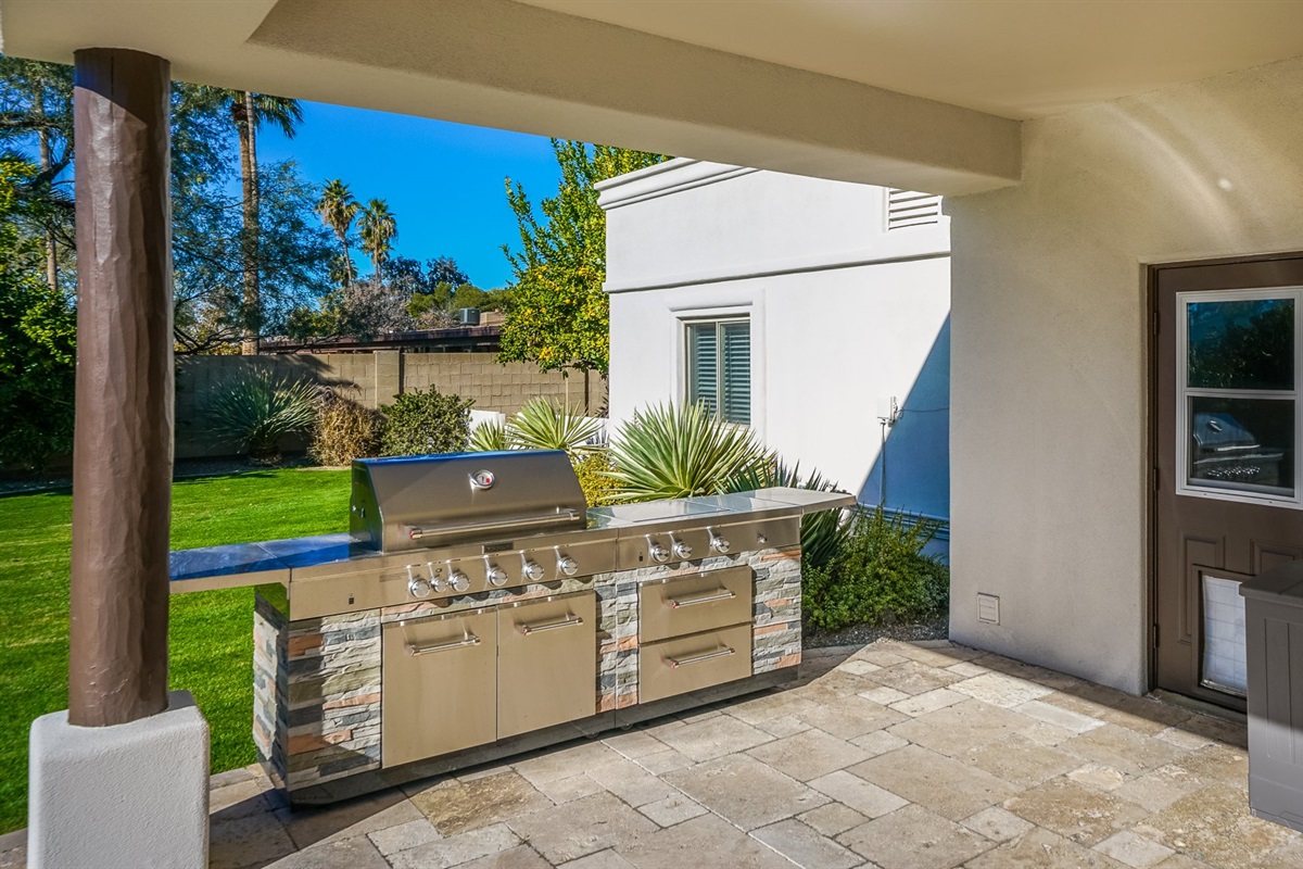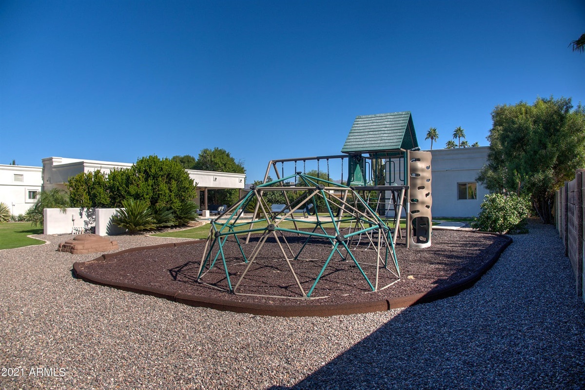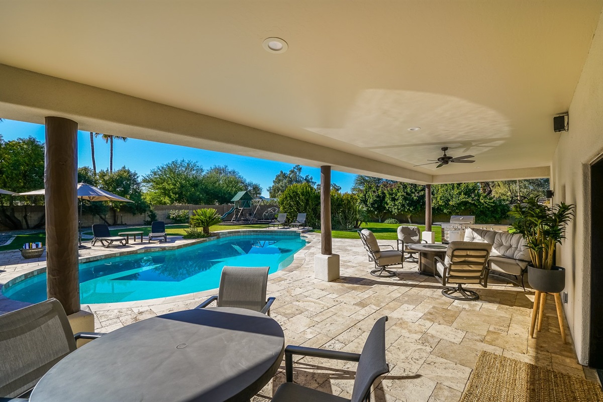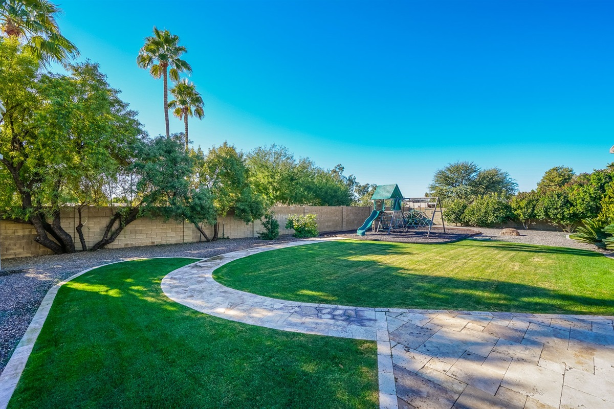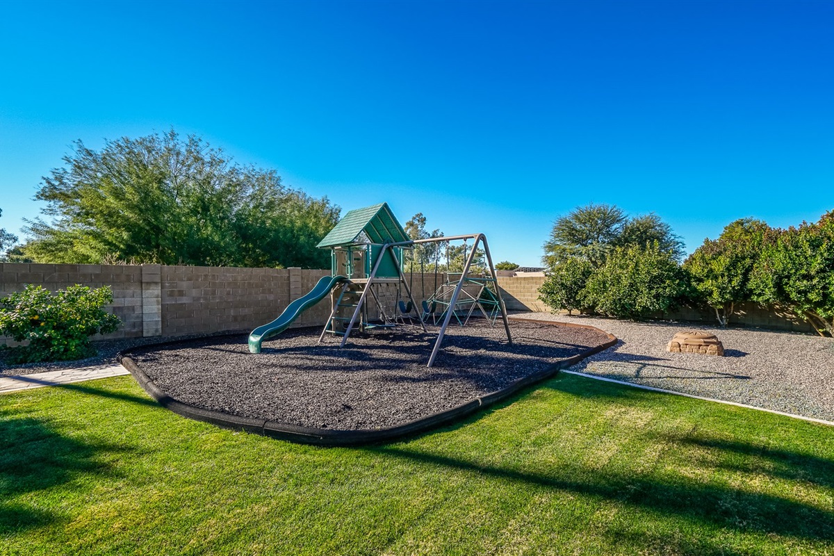 The backyard is tastefully equipped with new high-end patio furniture, large BBQ grill and a kids play area that includes a slide, swings, and monkey bars.