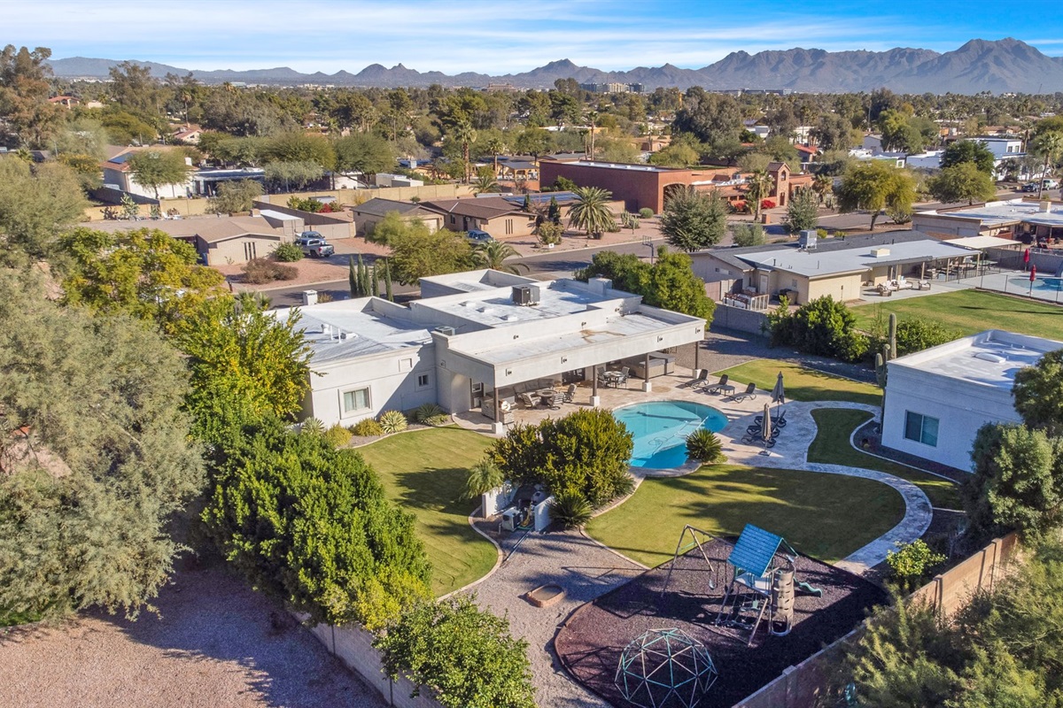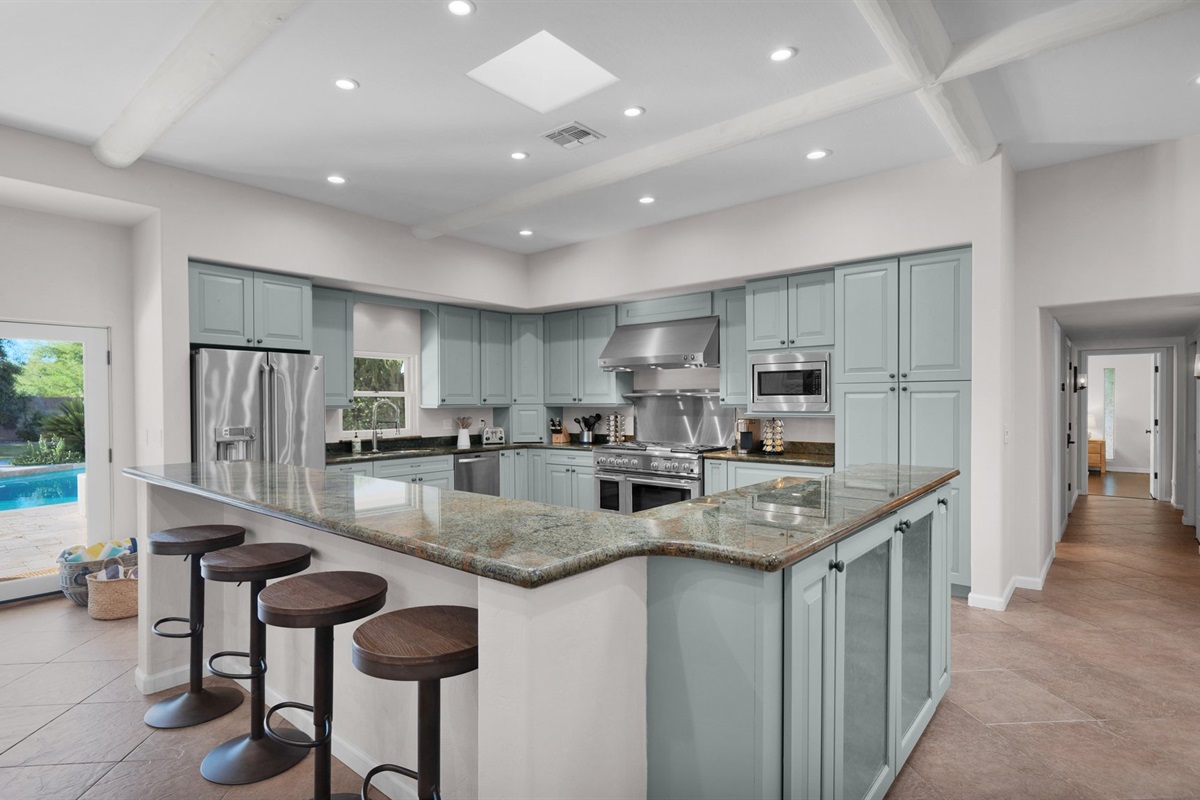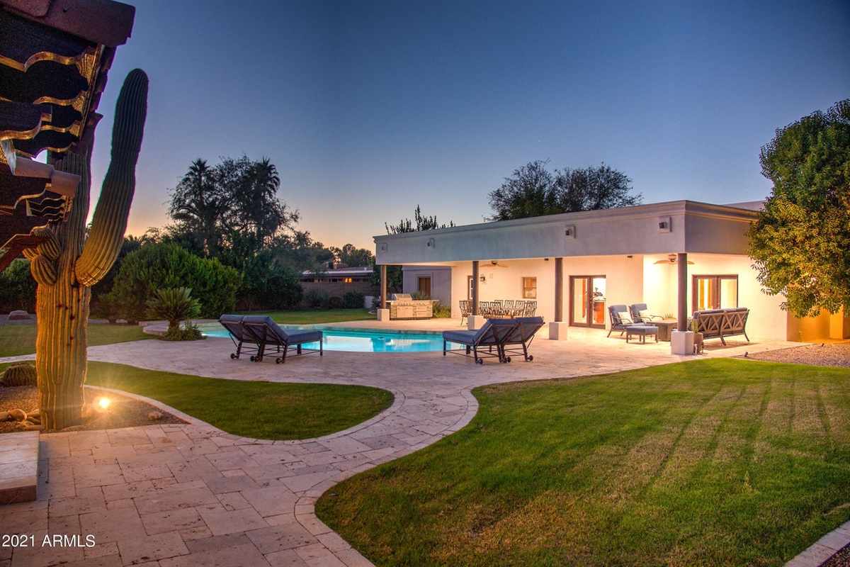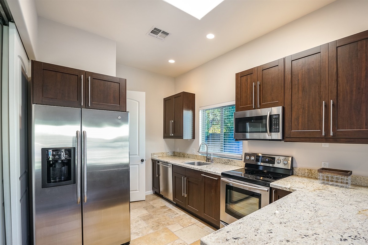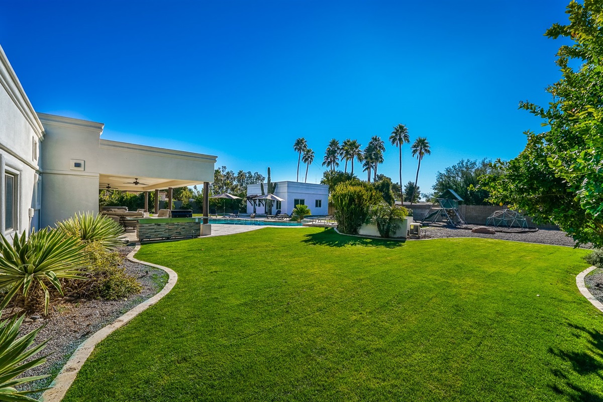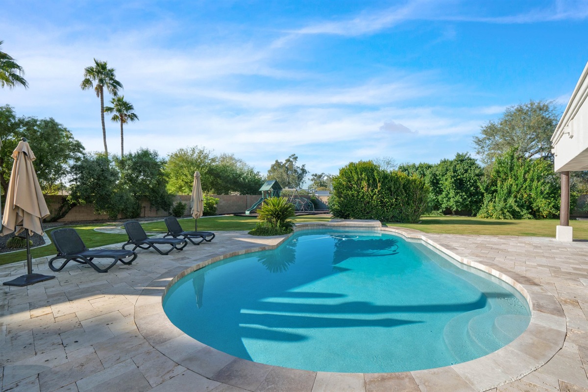 The backyard is tastefully equipped with new high-end patio furniture, large BBQ grill and a kids play area that includes a slide, swings, and monkey bars.