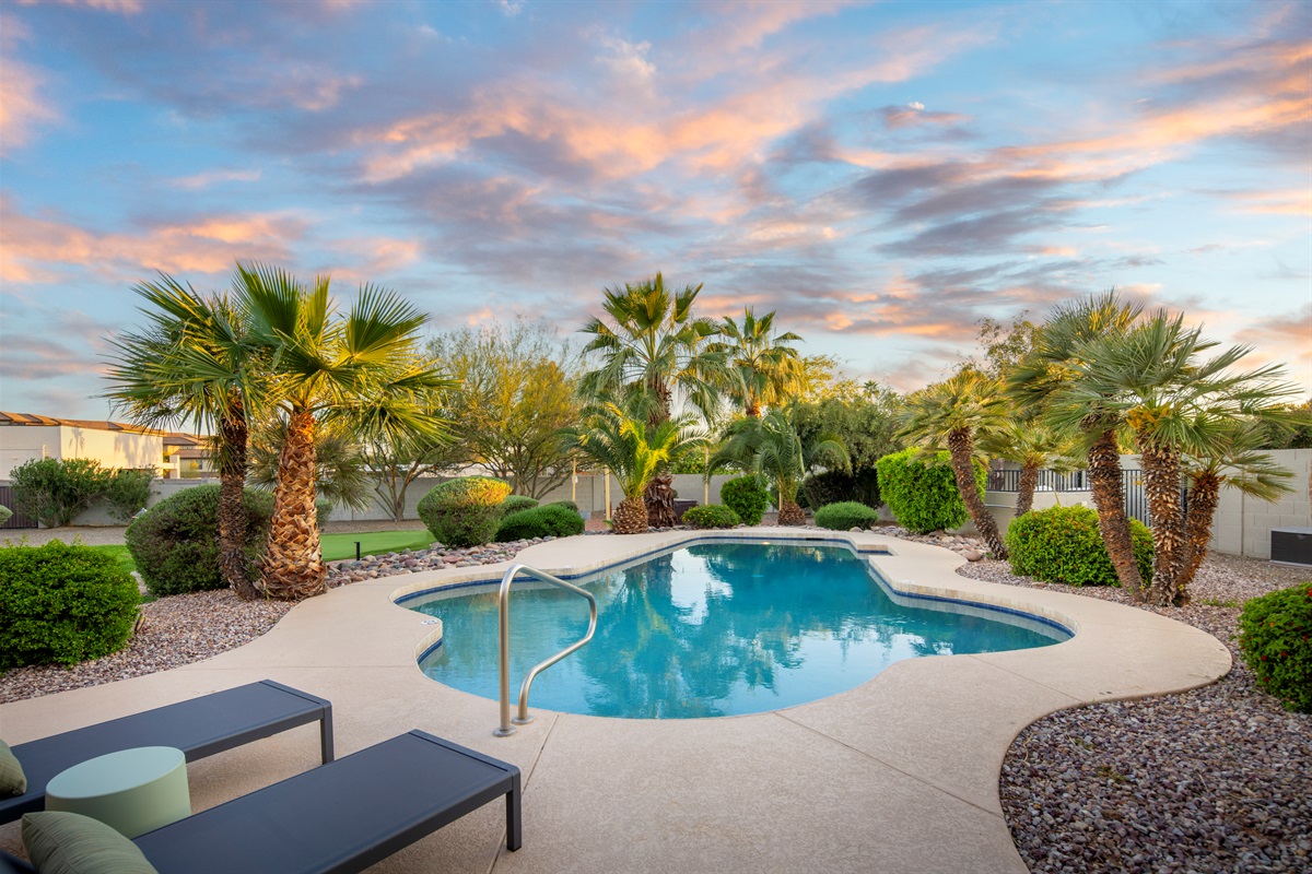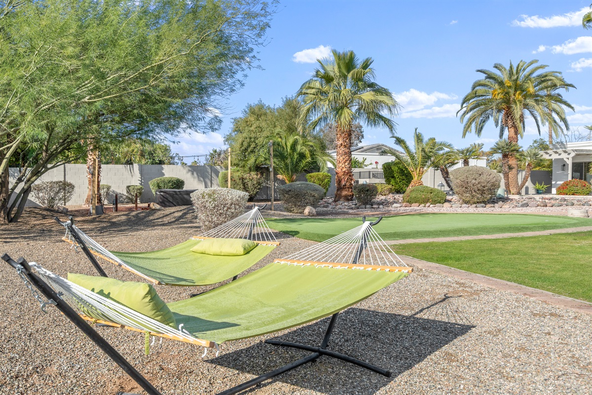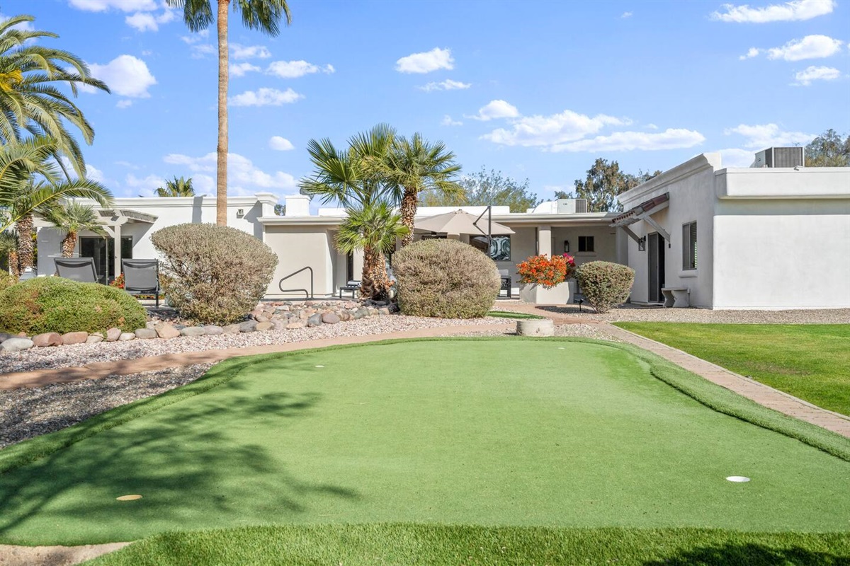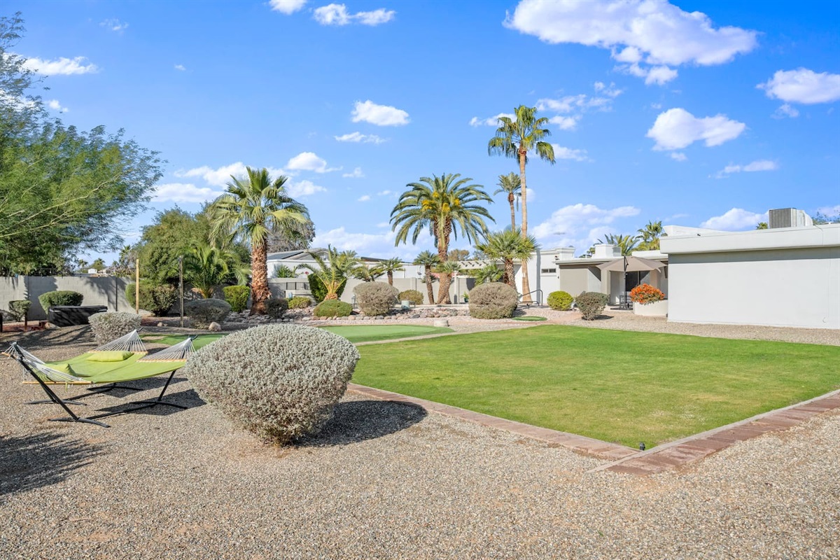 Surrounded by palm trees and lush landscaping, the back yard is your own private haven. Lounge by the heated pool, soak in the hot tub, or challenge your friends to a putting contest. The putting green, hammocks, and green square grass area (ideal for morning yoga or in-home massages) provide additional opportunities for relaxation and recreation. And the large, covered patio is perfect for al fresco dining and entertaining, of course.