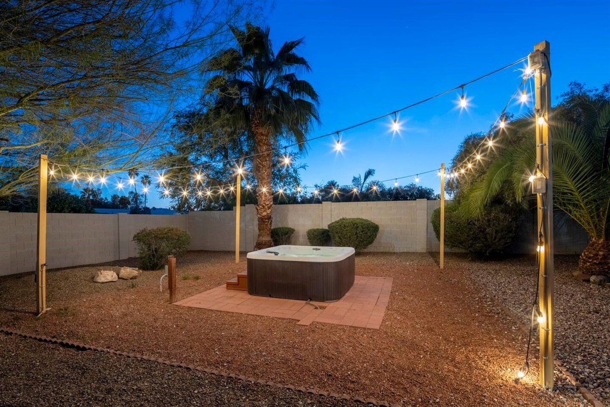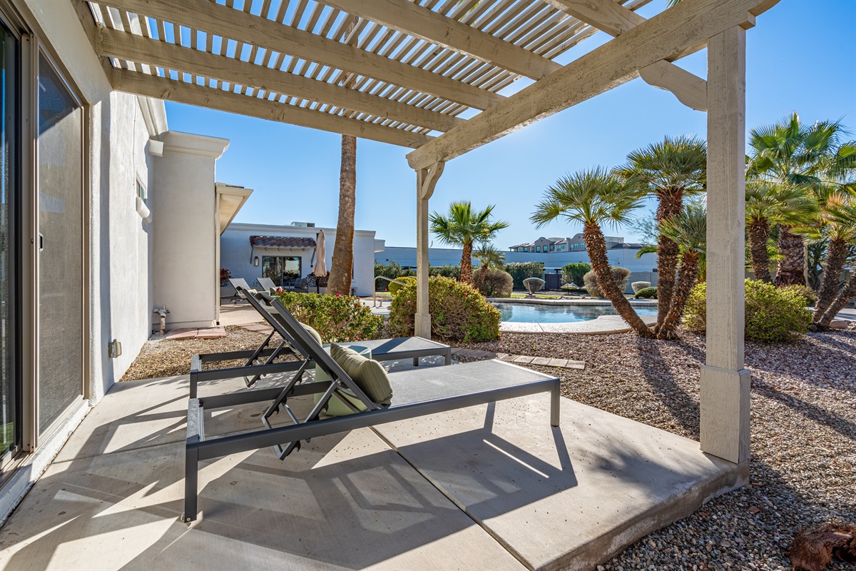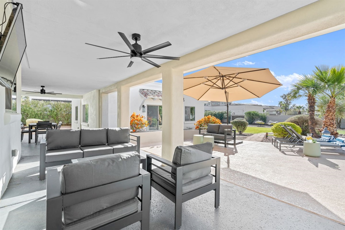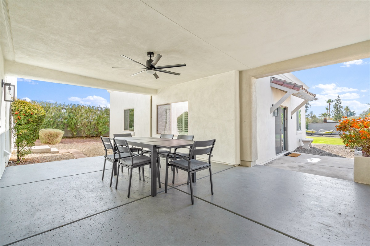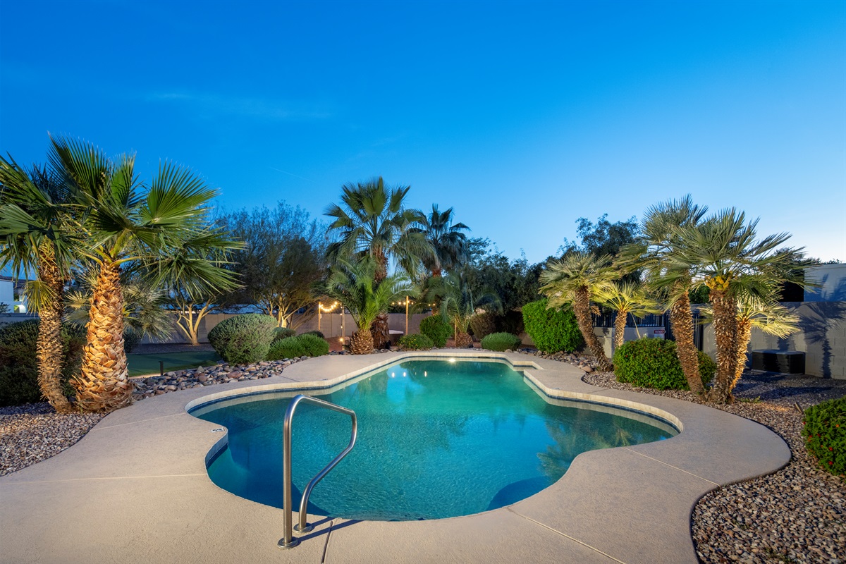 Surrounded by palm trees and lush landscaping, the back yard is your own private haven. Lounge by the heated pool, soak in the hot tub, or challenge your friends to a putting contest. The putting green, hammocks, and green square grass area (ideal for morning yoga or in-home massages) provide additional opportunities for relaxation and recreation. And the large, covered patio is perfect for al fresco dining and entertaining, of course.
