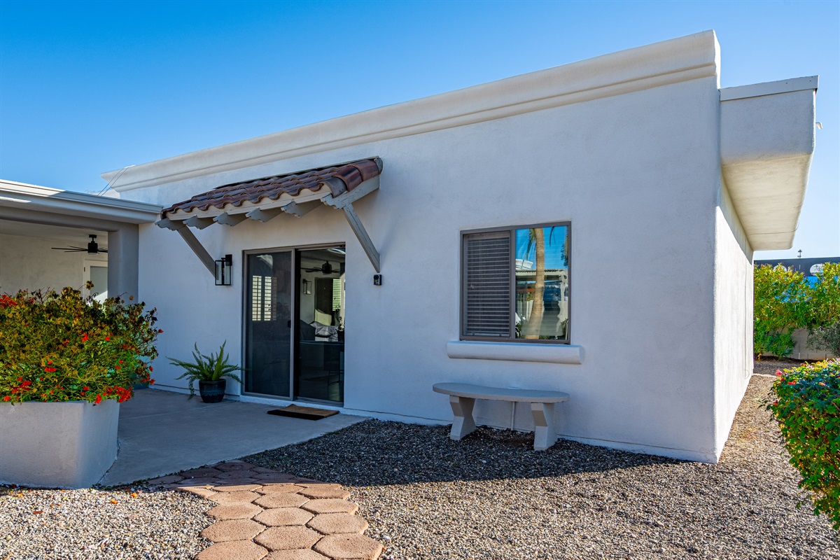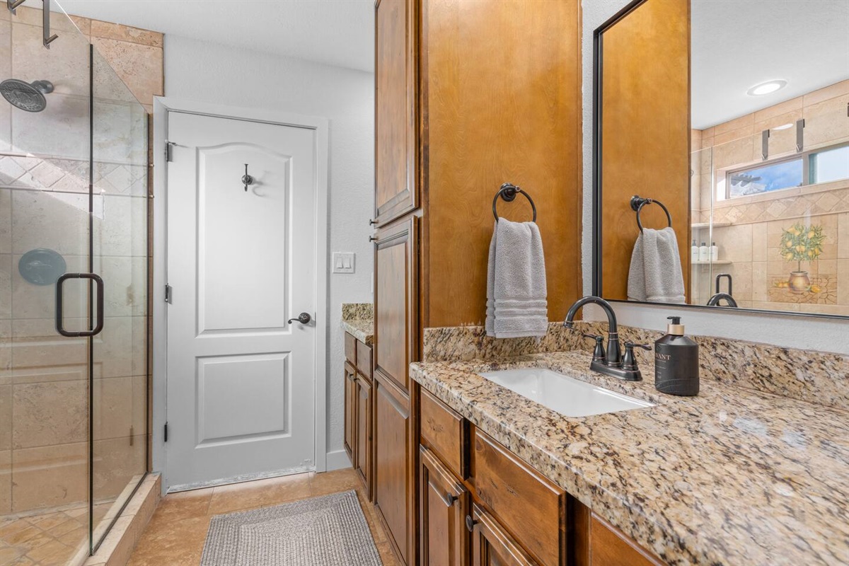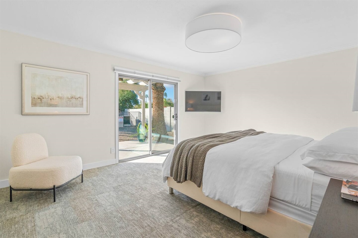 -Primary Suite: King-size bed with en-suite bathroom, walk-in closet, and slider door that opens to patio