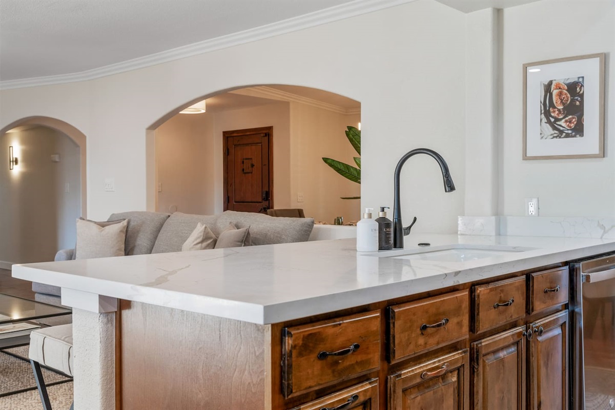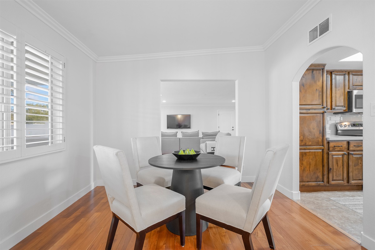 The fully stocked kitchen, complete with quality dishes and brand new quartz countertops entices even the most novice chef to whip up delightful meals. An attached dining room seats 12, plus there’s an additional breakfast nook table that seats 4. Guests can also make themselves at home in the Casita kitchen. Though it lacks a stove, it’s equipped with a fridge, coffee maker, all essential tableware, and a comfortable seating area. Or, if you prefer cooking outdoors, fire up the gas grill to prepare quick and delicious eats.