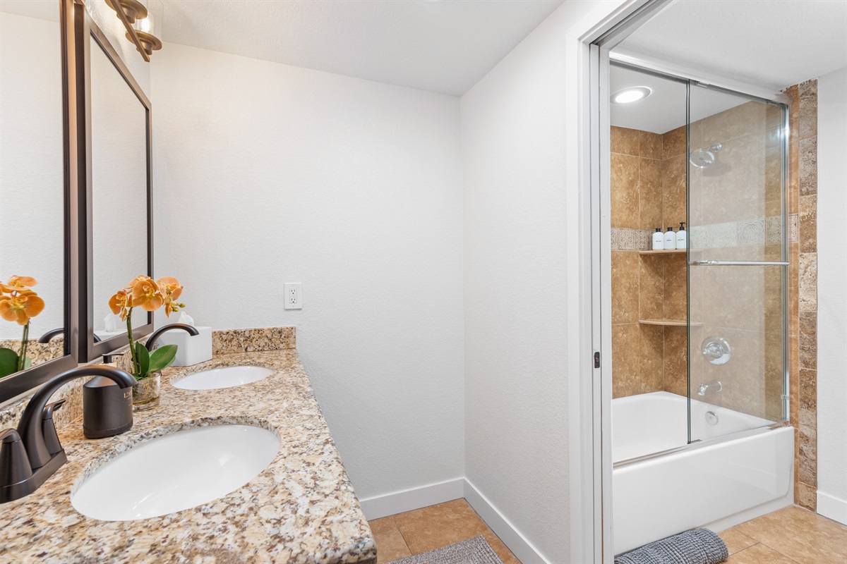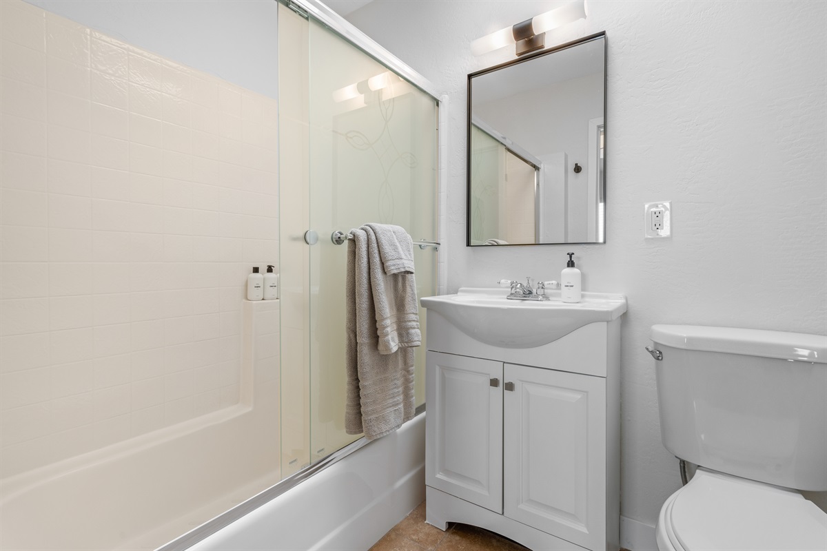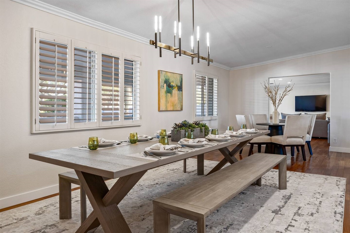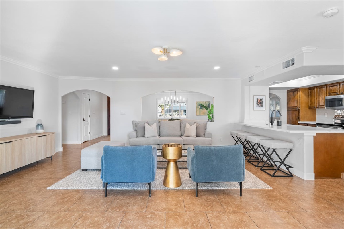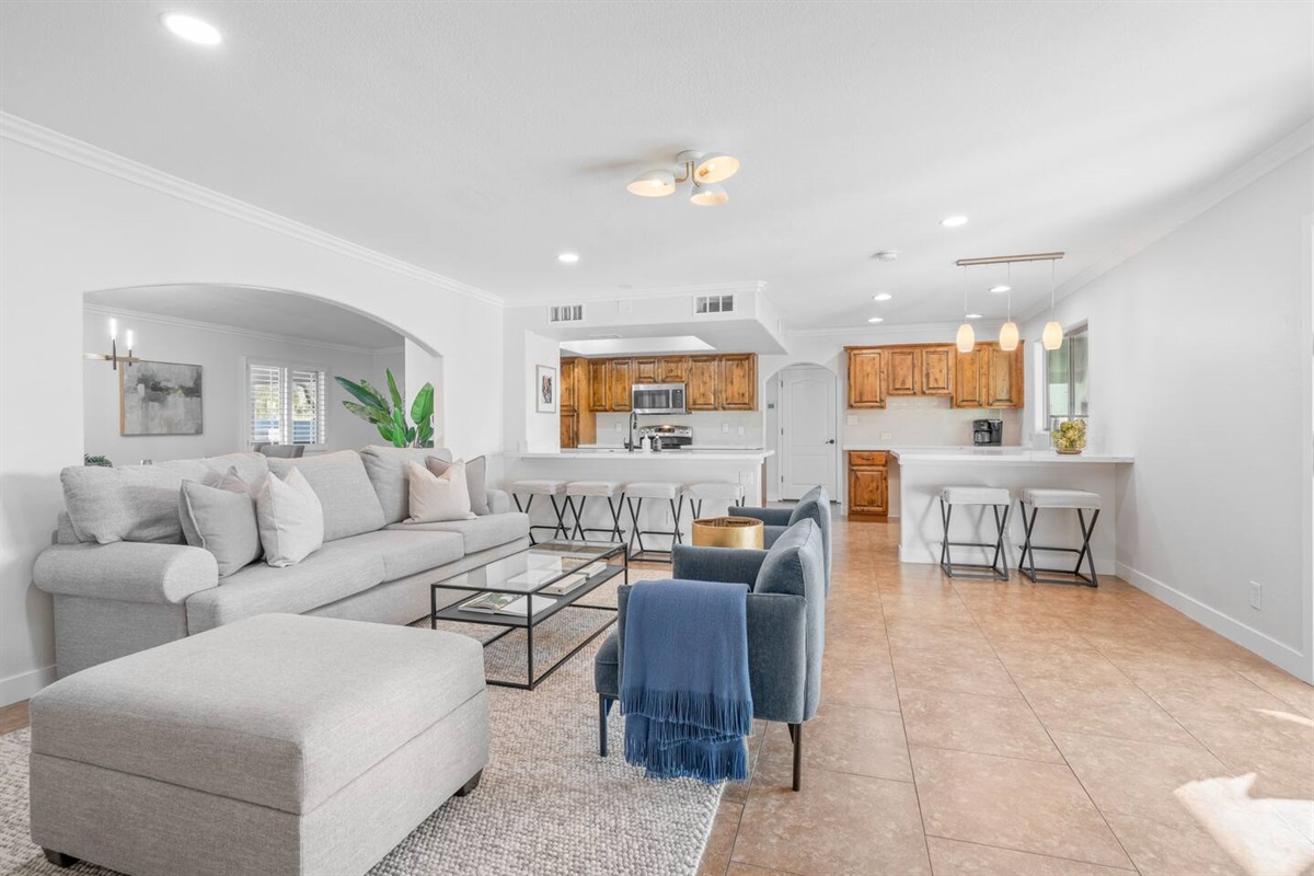 This impeccably furnished home and detached guest house has been recently restyled with a keen eye for detail and comfort. It offers six bedrooms, each featuring soft, high-quality bedding, cozy feather down comforters, and plush mattresses. Every bedroom is also equipped with a smart TV. The bathrooms provide plush towels and premium bath and body products. In addition to the bedrooms, the family room can be converted into an additional sleeping area. (See floor plan and bedroom layouts in the “Space Configuration” photo.)