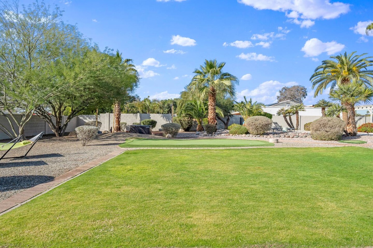 Surrounded by palm trees and lush landscaping, the back yard is your own private haven. Lounge by the heated pool, soak in the hot tub, or challenge your friends to a putting contest. The putting green, hammocks, and green square grass area (ideal for morning yoga or in-home massages) provide additional opportunities for relaxation and recreation. And the large, covered patio is perfect for al fresco dining and entertaining, of course.