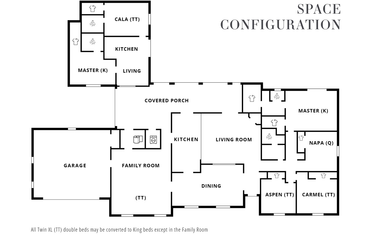 This impeccably furnished home and detached guest house has been recently restyled with a keen eye for detail and comfort. It offers six bedrooms, each featuring soft, high-quality bedding, cozy feather down comforters, and plush mattresses. Every bedroom is also equipped with a smart TV. The bathrooms provide plush towels and premium bath and body products. In addition to the bedrooms, the family room can be converted into an additional sleeping area. (See floor plan and bedroom layouts in the “Space Configuration” photo.)